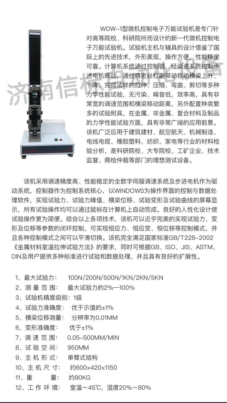 金屬材料壓縮彎曲實驗口罩塑料拉伸強度試驗機主要技術(shù)指標: 1、最大試驗力: 100N/200N/500N/1KN/2KN/5KN 2、測 量 范 圍: 最大試驗力的2%—100% 3、試驗機精度級別:1級 4、試驗力準確度: 優(yōu)于示值的±1% 5、橫梁位移測量: 分辨率為0.01mm 6、變形準確度: 優(yōu)于±1% 7、調(diào) 速 范 圍: 0.05-500mm/min 8、試 驗 空 間: 950mm 9、主 機 形 式: 單臂式結(jié)構(gòu) 10、主 機 尺 寸: 約600×420×1150 11、重 量: 約90Kg 12、工 作 環(huán) 境: 室溫~45℃,濕度20%~80%