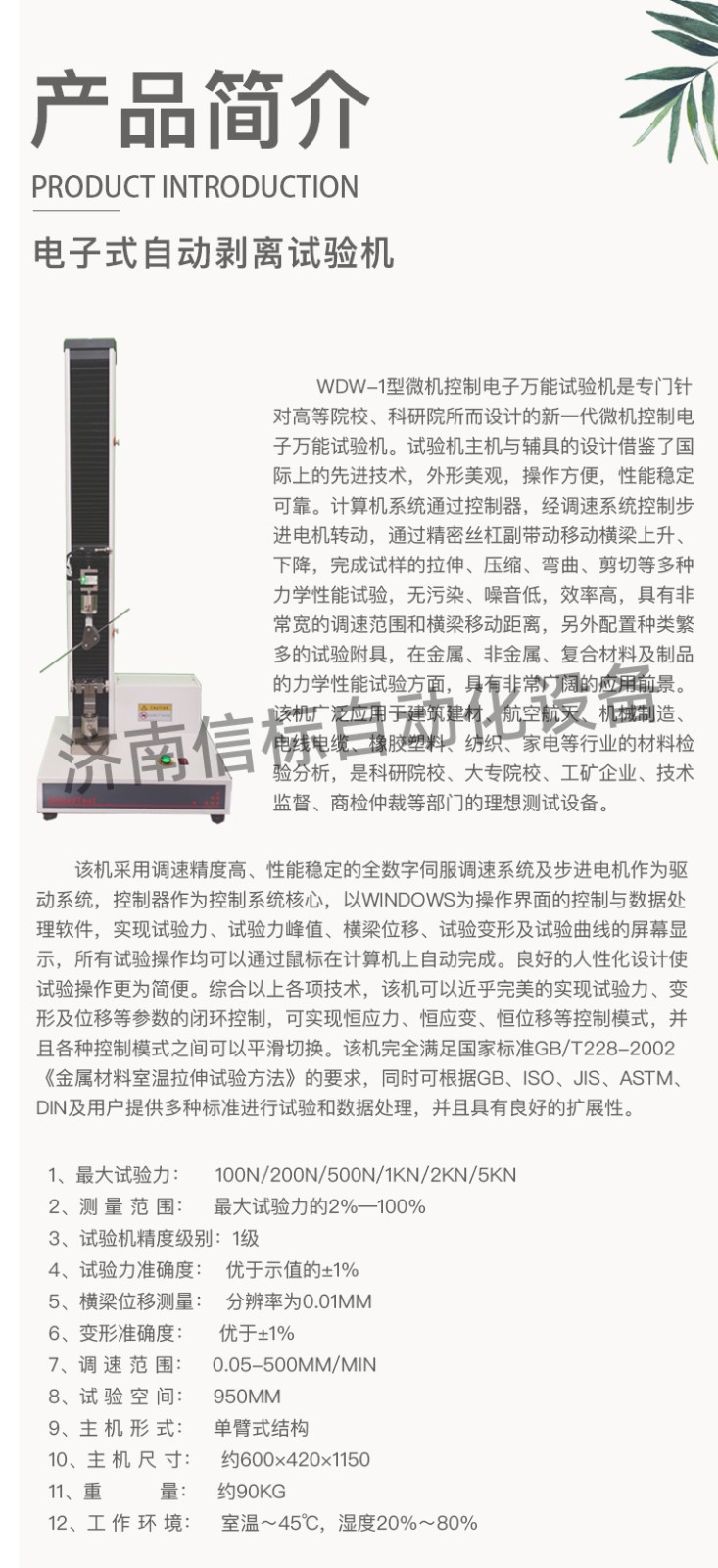 高強(qiáng)度膠黏劑膠帶浮棍法90度180度剝離強(qiáng)度試驗機(jī)主要功能及特點: 1、主機(jī): 1.1調(diào)速系統(tǒng)采用伺服電機(jī)和自主研發(fā)減速系統(tǒng),性能穩(wěn)定可靠,具有過流、過壓、過載等保護(hù)裝置。調(diào)速范圍可達(dá)0.05~500mm/min。 1.2傳動部分采用圓弧同步齒形帶,精密絲杠副傳動,傳動平穩(wěn),噪音低,傳動效率高。 1.3萬向節(jié)采用十字插銷結(jié)構(gòu),而且具有擺角限制功能,一方面便于試樣夾持,保證試驗同心度,另一方面很好的消除了不規(guī)則試樣對傳感器的影響。 2、控制系統(tǒng)、操作軟件及數(shù)據(jù)處理系統(tǒng) 2.1計算機(jī)控制系統(tǒng),具有集成度高、性能穩(wěn)定、調(diào)整方便等優(yōu)點??梢詫嶒灁?shù)據(jù)進(jìn)行實時采集,對實驗特性曲線實現(xiàn)實時動態(tài)顯示,試驗數(shù)據(jù)文件能以Access常用數(shù)據(jù)庫或SQLserve大型數(shù)據(jù)庫的方式保存,方便實現(xiàn)客戶的資源共享及網(wǎng)絡(luò)管理,以及用戶的再分析。對于用戶自定義的各種word2000報表,該軟件可輕松實現(xiàn)訪問,解決了不同用戶或同一用戶在不同時期對試驗報表有不同需要的難題。該軟件可處理試驗力、位移、時間、變形的原始數(shù)據(jù)及由此派生的曲線。
