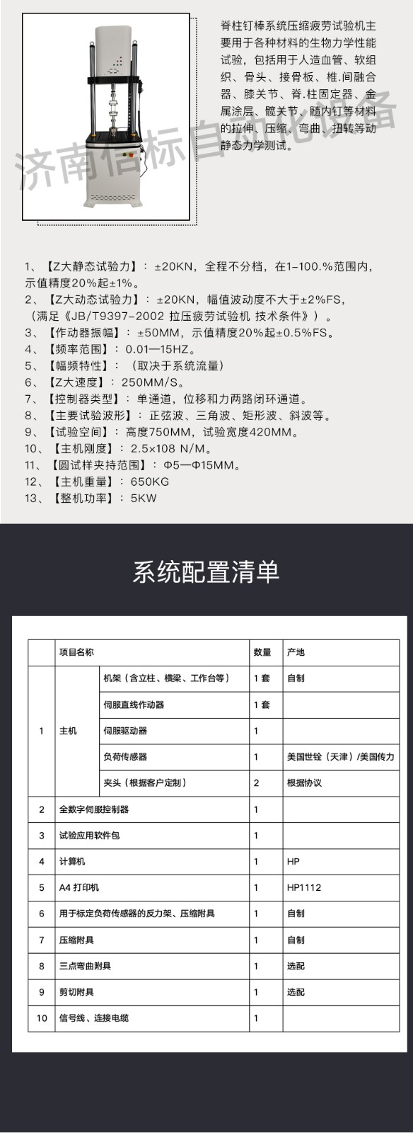 濟南信標自動化設備有限公司主要生產:動靜態(tài)萬能疲勞試驗機,接骨板彎曲試驗機,縫合線拉伸疲勞試驗機,髖膝關節(jié)磨損試驗機,電子萬能試驗機、液壓萬能試驗機、巖石三軸、四軸,電液拉力試驗機,材料試驗機,高低溫蠕變,高低頻疲勞,拉伸、扭轉、杯突等二十多個系列兩千多個的品種。