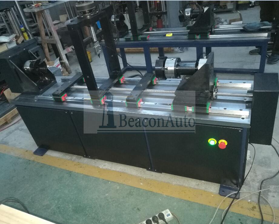 LNW-10000/50/50貫流風葉軸向徑向加載試驗機 主要用途 LNW-10000/50/50貫流風葉軸向徑向加載試驗機主要應用于檢測空調(diào)器貫流風葉或其它部件的軸向拉力,徑向扭矩及徑向加載,為空調(diào)器制造商和零部件制造商提供了可靠的檢測設備。 貫流風葉軸向徑向加載試驗機特 點 1拉伸和扭轉(zhuǎn)試驗可以一次裝夾,順序進行。 2顯 示:數(shù)字顯示拉力、變形、扭矩、轉(zhuǎn)角。 3加載方式:電動 4.1自動分析:根據(jù)相關標準要求,自動分析試驗數(shù)據(jù). 4.2 曲線遍歷:試驗完成后,可對曲線進行分析,用鼠標找出試驗曲線上各點對應的數(shù)據(jù); 4.3曲線選擇:可根據(jù)需要選擇應力-應變、力-位移、力-時間、位移-時間等曲線進行顯示和打??;并能一目了然的反映出試樣在拉力作用下的破壞過程及試樣每一點的數(shù) 據(jù)分析。 4.4自動分析:試驗曲線上的任意段可進行局部放大分析。 4.5 批量處理:將多個試驗數(shù)據(jù)和曲線匯總比較并顯示打印. 4.6試驗報告:多種報告編輯方法(Exsel\World\高級自定義),用戶可根據(jù)需要自行編輯報告格式 4.7限位保護:具有程控和機械兩種限位保護; 貫流風葉軸向徑向加載試驗機主要技術指標 試驗及級別:1級 最大拉伸試驗力: 10000N 最大試驗扭矩: 50 Nm 最大徑向試驗力: 500N 位移最小讀數(shù):0.01mm 位移最大讀數(shù):600.00mm 角位移最大讀數(shù):999.99度 角位移最小讀數(shù):0.1度 最大行程:1200mm 電源:220V 50Hz 貫流風葉軸向徑向加載試驗機扭轉(zhuǎn)部分: 1.項目簡介 扭轉(zhuǎn)部分是由加載系統(tǒng)、傳動系統(tǒng)、數(shù)字式數(shù)據(jù)采集處理系統(tǒng)及計算機測量控制顯示系統(tǒng)等組成,適用于對軸流風扇靜態(tài)扭轉(zhuǎn)力學的性能測試。該機采用落地臥式結(jié)構(gòu)。計算機屏幕顯示,數(shù)字式數(shù)據(jù)采集控制系統(tǒng)和全數(shù)字交流伺服系統(tǒng)組成閉環(huán)控制。采用行星擺線針輪減速器傳動,具有加載均勻、穩(wěn)定、無沖擊現(xiàn)象、數(shù)據(jù)采集控制準確的特點。 試驗測試功能:Win2000/XP中文操作平臺。使用以圖形為界面的視窗式操作系統(tǒng),可設定顯示屏幕及操作面板;可設定試驗速度及各種控制參數(shù);可實時顯示基本試驗結(jié)果(斷裂值、峰值);可實時顯示試驗過程各種相關參數(shù)圖形;可實現(xiàn)系統(tǒng)診斷并顯示診斷結(jié)果。試驗機實現(xiàn)分級管理權(quán)限。不同的用戶可進入不同的管理界面、分三級用戶管理權(quán)限。 整機利用全數(shù)字交流伺服控制系統(tǒng)及數(shù)字式數(shù)據(jù)采集處理系統(tǒng),光電編碼器采集試樣的扭轉(zhuǎn)角度。 2.目的: 軸流風扇的靜態(tài)扭轉(zhuǎn)實驗 3.貫流風葉軸向徑向加載試驗機方案描述 【主 機】采用臥式結(jié)構(gòu),主體結(jié)構(gòu)采用焊接結(jié)構(gòu),以保證整機的剛性。夾具采用優(yōu)質(zhì)合金結(jié)構(gòu)鋼40CrNiMoA淬火(HRC45~50)方式,主傳動軸采用優(yōu)質(zhì)合金結(jié)構(gòu)鋼淬火處理,保證其使用壽命。試樣的安裝、拆卸方便、快捷。 【驅(qū)動系統(tǒng)】由全數(shù)字交流伺服控制系統(tǒng)驅(qū)動。速度調(diào)節(jié)范圍寬,加載均勻、穩(wěn)定。 【傳動系統(tǒng)】采用行星擺線針輪減速器傳動,保證傳動的均勻、穩(wěn)定及傳動精度。縱向空間可以根據(jù)汽車半軸的規(guī)格進行調(diào)整,橫向空間根據(jù)驅(qū)動橋的規(guī)格任意手動調(diào)節(jié)。 【測量顯示系統(tǒng)】該機采用光電編碼器采集試樣的扭轉(zhuǎn)角度,高精度扭矩傳感器采集試樣的扭矩。計算機屏幕顯示試樣的扭矩、扭轉(zhuǎn)角度、扭轉(zhuǎn)剛度以及各類曲線等。 【軟件操作】 ★控制模式采用智能專家設置系統(tǒng),用戶可以根據(jù)自己的實際要求編制試驗過程控制方式,自動完成試驗。 ★ Windows2000/XP全中文界面,人機對話方式。試驗的全部操作均借助CRT,通過計算機鍵盤與鼠標完成,計算機屏幕顯示試驗扭矩T,扭轉(zhuǎn)角度θ,扭轉(zhuǎn)次數(shù),各種試驗曲線(扭矩-時間曲線、扭矩-角度曲線、角度-時間曲線等)試驗機工作狀態(tài)等。 ★曲線坐標的大小可以根據(jù)實際的試驗數(shù)據(jù)進行調(diào)整。 ★輸出打印各種試驗報表格式(報表格式可以Excel或Word格式輸出)。 ★符合JB/T9370—1999《扭轉(zhuǎn)試驗機技術條件》及GB10128—88《金屬室溫扭轉(zhuǎn)試驗方法》數(shù)據(jù)處理的相關要求。 ★可以設定以正弦波或方波的方式進行循環(huán)加載。 ★ 試驗過程可以實現(xiàn)模擬再現(xiàn)。 ★ 可以任意多條試驗曲線疊加對比、輸出打印。 ★ 可以進行數(shù)字化調(diào)零和標定。 ★ 試驗數(shù)據(jù)采用數(shù)據(jù)庫管理方式,便于查詢和維護。 ★ 軟件系統(tǒng)的操作可以實現(xiàn)三級用戶管理,安全、方便、快捷。 【安全保護系統(tǒng)】過載保護、過電流、過電壓保護、超速保護、工作值保護、行進保護等。 4.貫流風葉軸向徑向加載試驗機主要技術性能指標: 4. 1大輸出扭矩:±50Nm;測量范圍:±0.1~±50Nm 4. 2驗扭矩示值相對誤差:±1% 4.3試驗扭矩重復性相對示值誤差:≤1% 4.4扭矩測量范圍:1%~100% 4.5縱向空間:0~1200mm可調(diào) 4. 6轉(zhuǎn)角度分辯率:0.10; 4. 7加載方式:可以設定以一定速度或扭距進行持續(xù)加載。 4. 8加載速度:0.005~3r